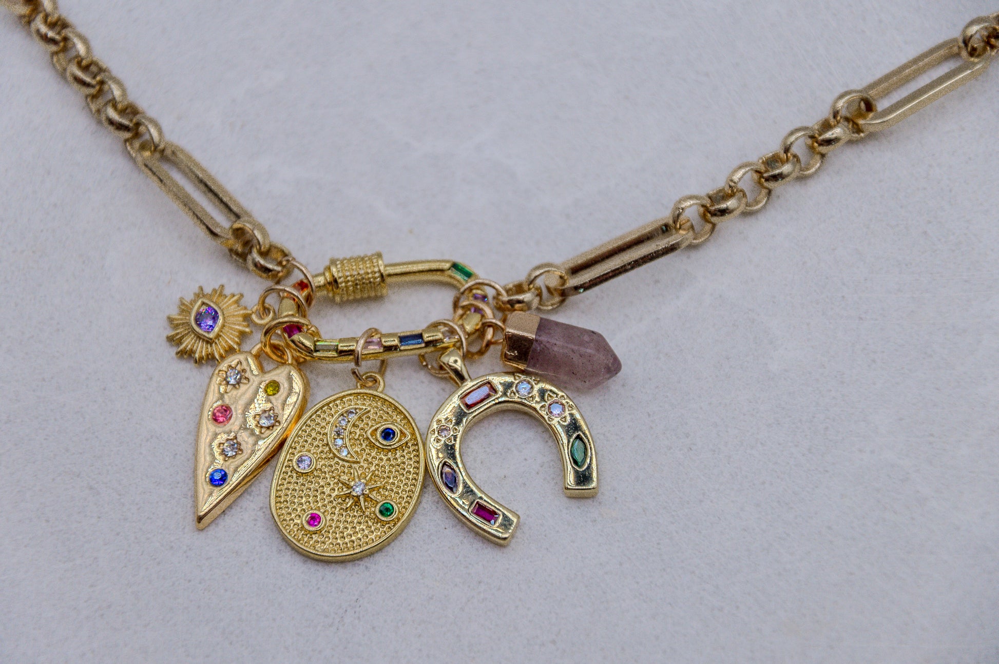 The Fortuna Car Charm is a rare and radiant piece from our Debut Collection designed to elevate your drive with intention, beauty, and luck. Set on a stunning gold-plated chain, it weaves together 5 charms from our Core Collection — a golden heart adorned with multi-colored cubic zirconias for love, a violet-hued evil eye for protection, a gemstone-studded golden horseshoe for luck, and a faceted amethyst for spiritual balance.